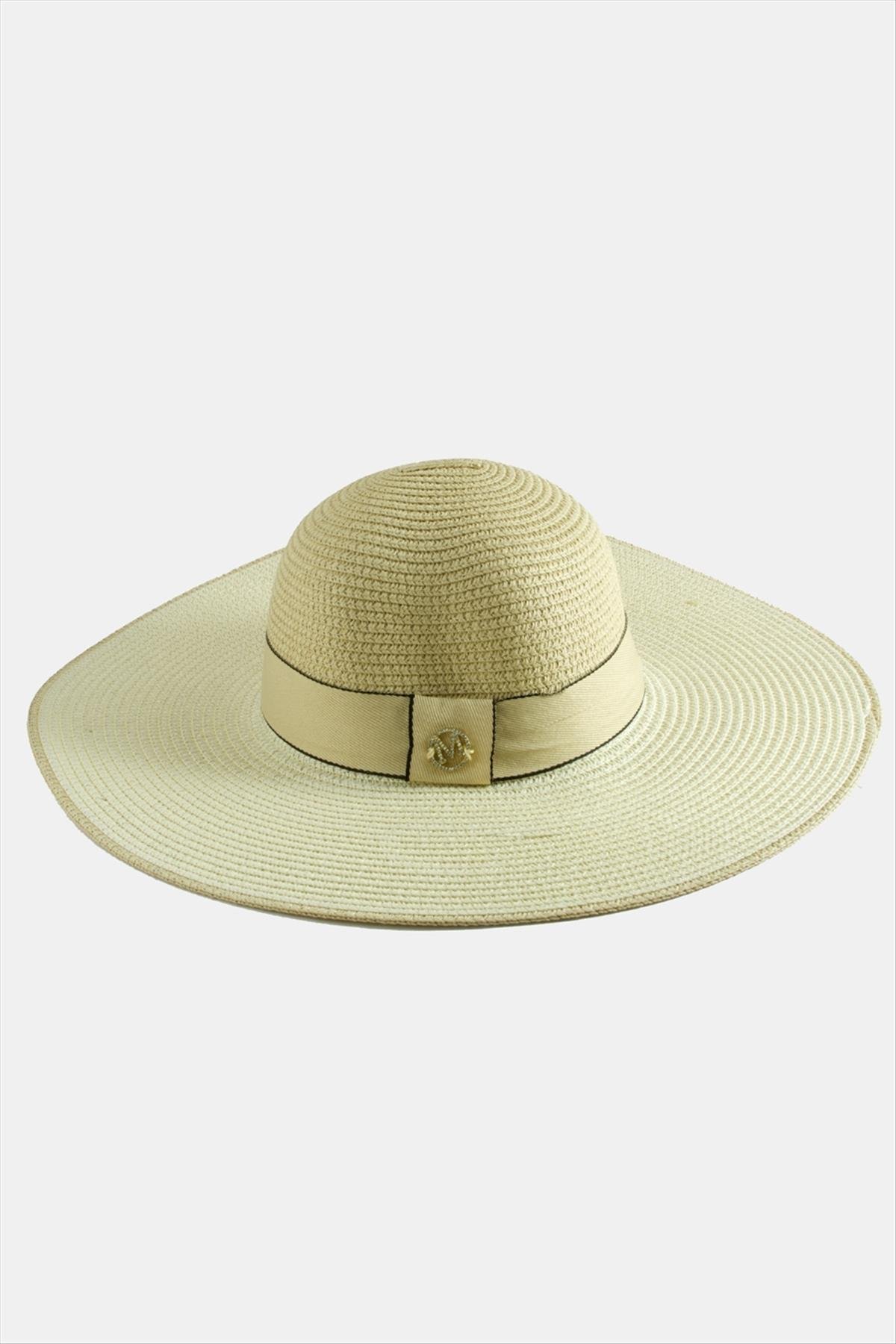 Şeritli Hasır Şapka-Krem