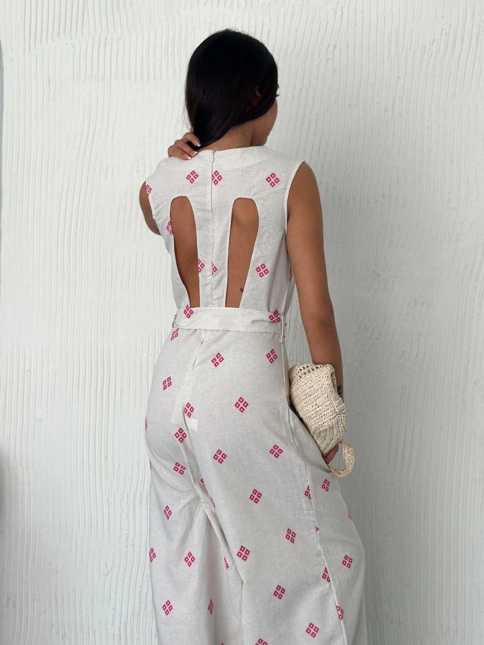 Sırt dekolteli keten beyaz tulum, gardırobunuzun şıklığını tamamlayacak harika bir seçenektir.