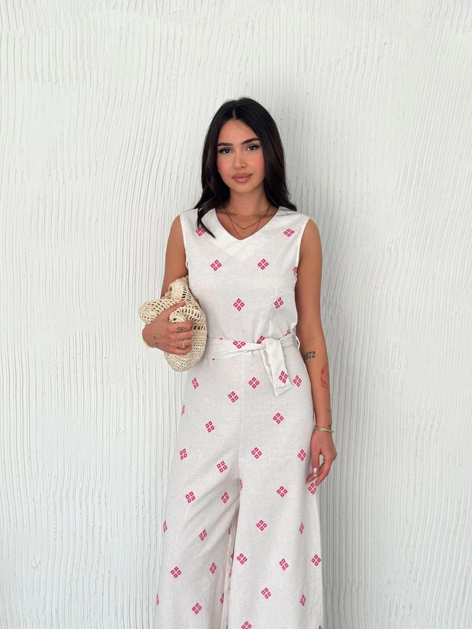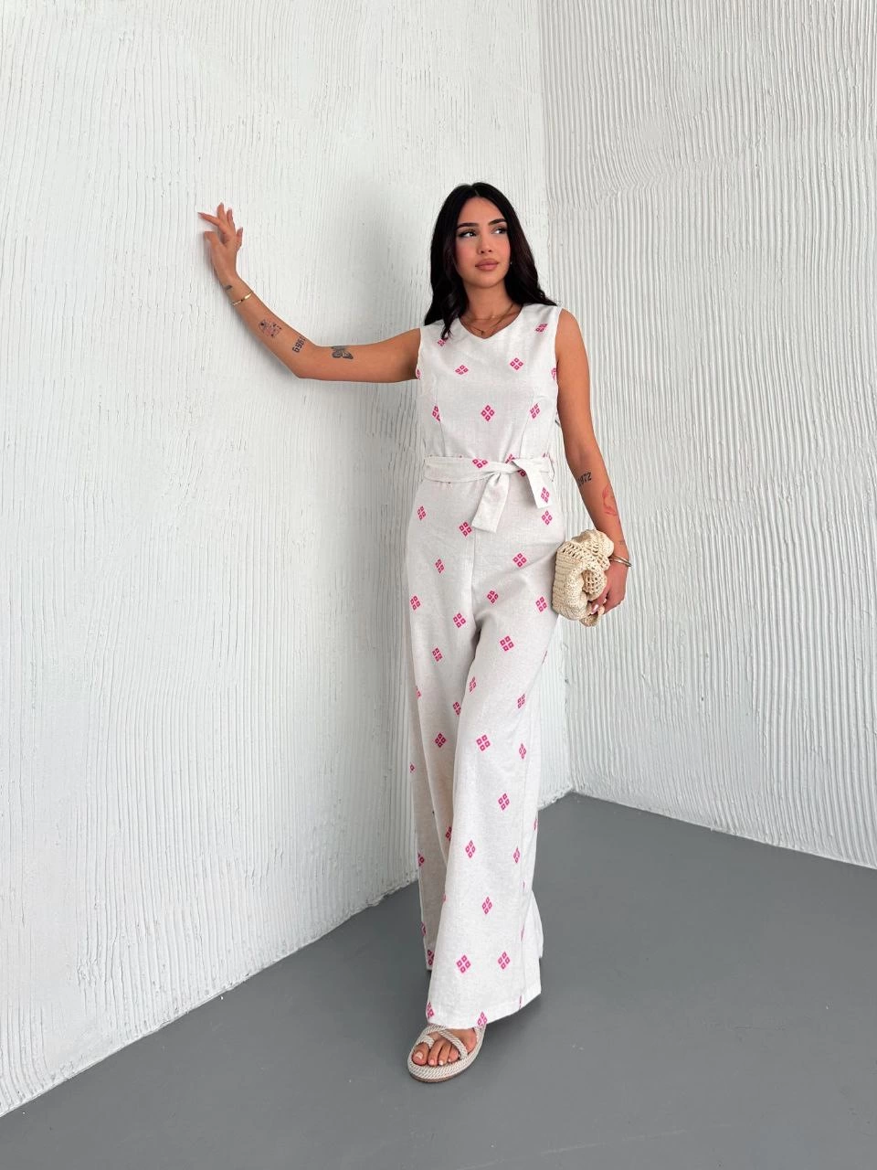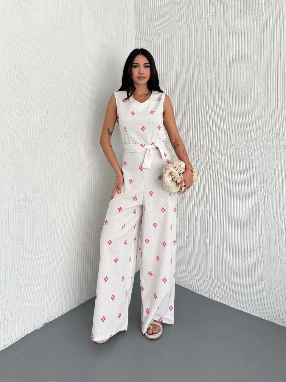 Sırt dekolteli keten beyaz tulum S1036 (Beden: M)