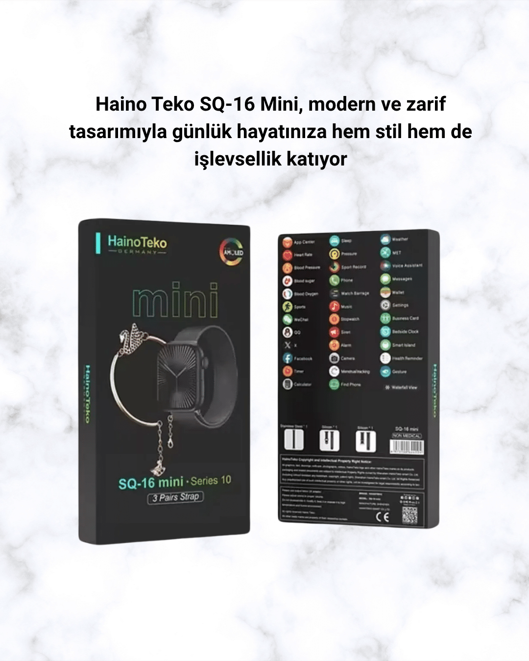 Özel günlerde sevdiklerinize teknolojik bir hediye vermek istiyorsanız, SQ-16 Mini Series 10 tam size göre. 3 değiştirilebilir kordonu ve şık bileklik hediyesiyle dikkat çeken bu model, kutusuyla birlikte şık bir sunum sağlar. Kullanışlı ve estetik bir hediye alternatifi arayanlar için mükemmel bir tercih.