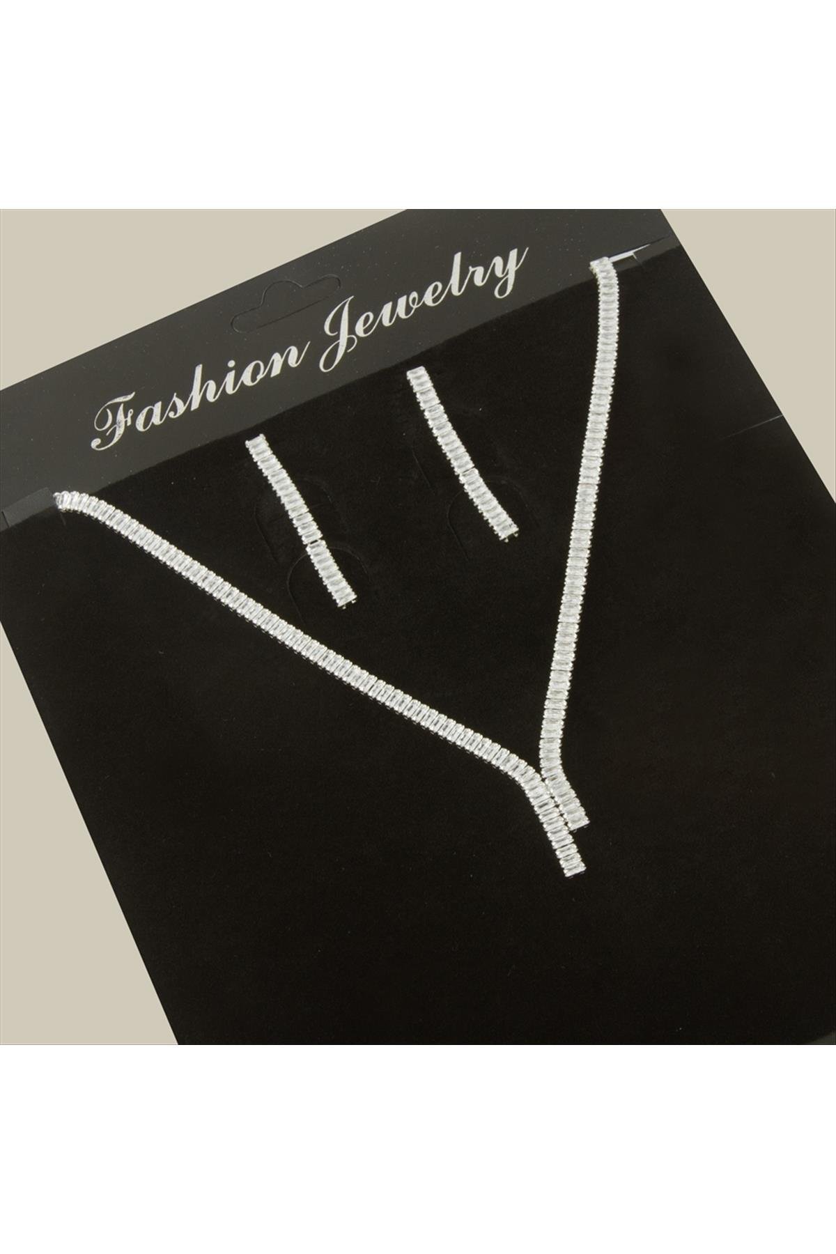 Tamtur Baget Taşlı Lüks Set Kolye 4 mm-Gümüş Rengi