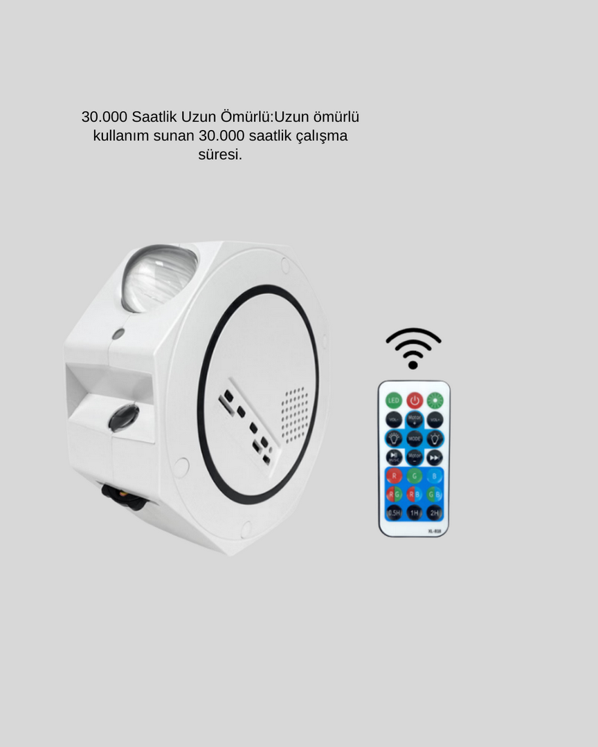 Bu 360° döndürülebilir gökyüzü projektörü, ışık açısını serbestçe ayarlama imkânı sunarak en ideal projeksiyon deneyimini sağlar. Yıldızlı gökyüzü efektleri, mekâna derinlik kazandırarak görsel olarak etkileyici bir ortam oluşturur.