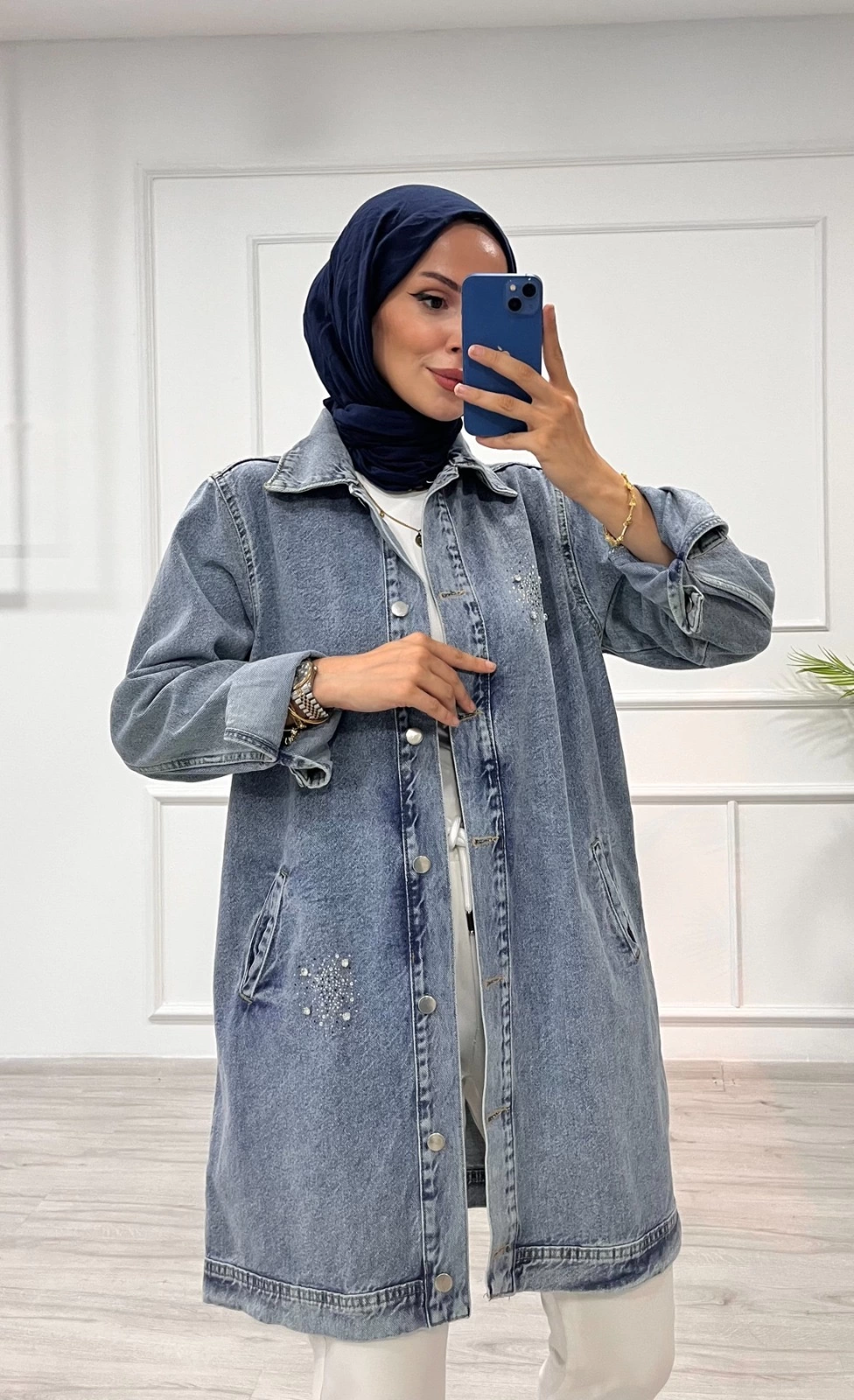 Taşlı tunik ceket kar yıkamalı mavi d2516 (Beden: S/M)