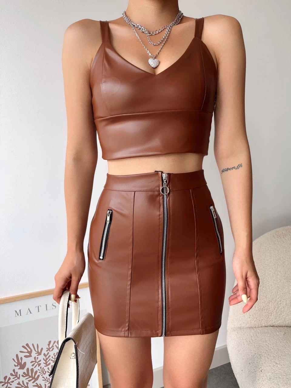 Üç Fermuarlı Deri Etek Kahve S24510 (Beden: M)