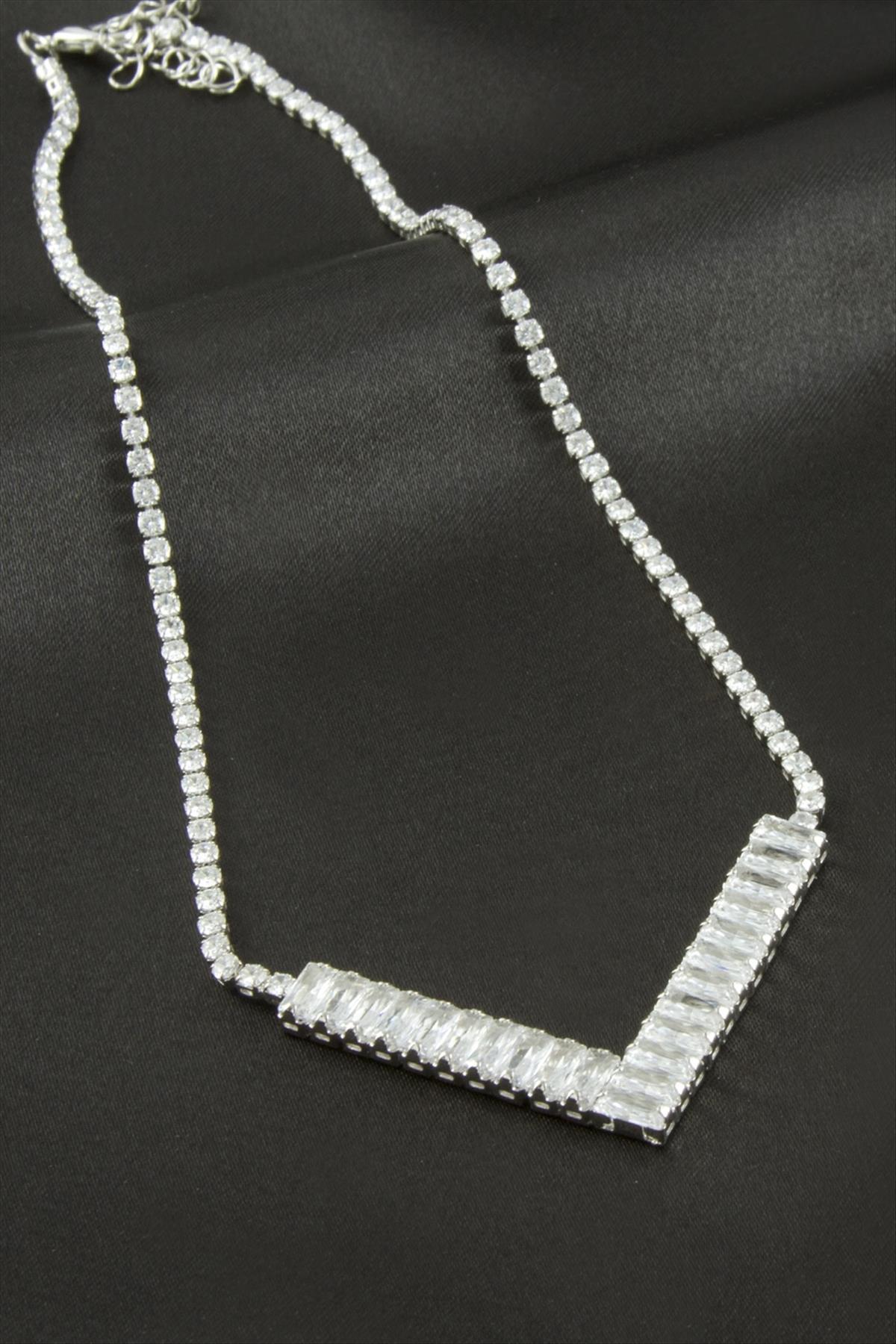 Üçgen Tamtur Zirkon Taşlı Lüks Kolye 8 mm-Gümüş Rengi