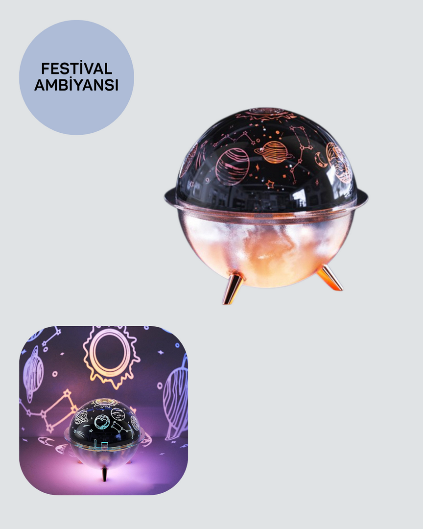 Galaksi, yıldız ve kozmik ışık efektleri ile donatılmış projeksiyon sistemi, tavana ve duvarlara yansıtarak bulunduğunuz ortamı adeta bir uzay yolculuğuna çıkarır. Özellikle yatak odalarında sakinleştirici bir atmosfer oluşturur. Çocuk odalarında hayal gücünü desteklerken, yetişkinler için de stres azaltıcı bir ambiyans sağlar.