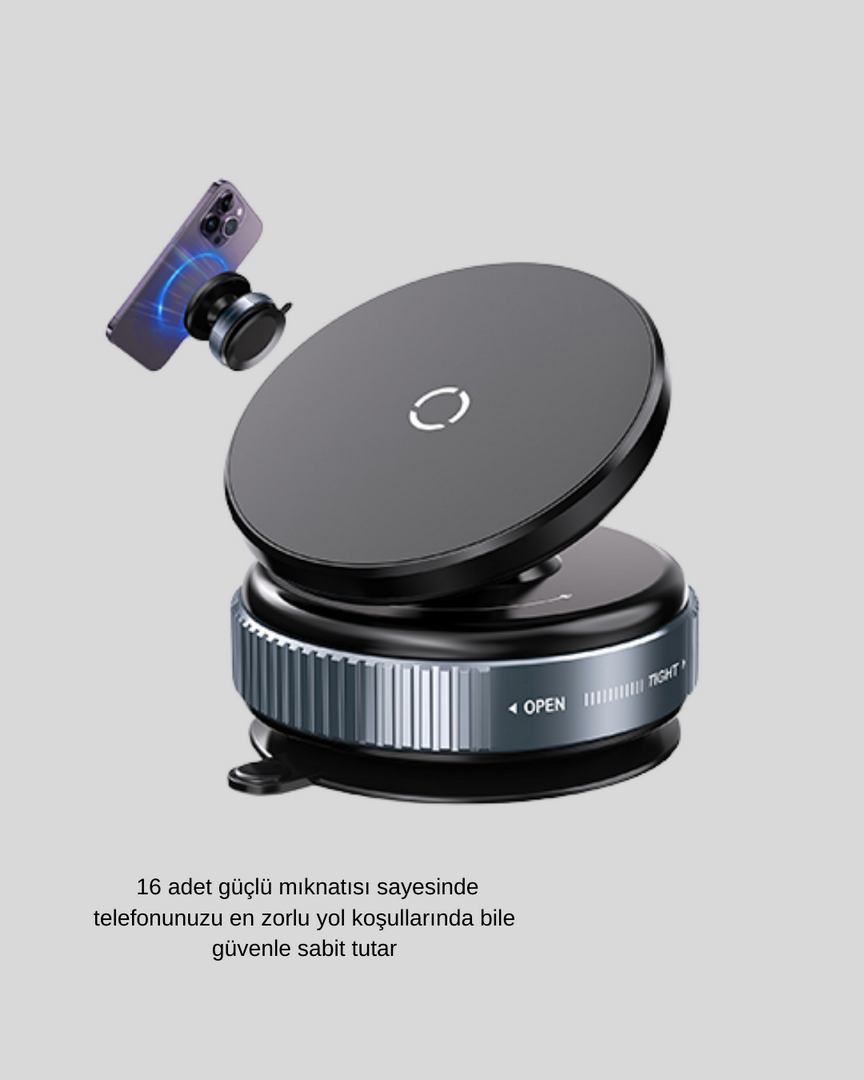 Bu gelişmiş manyetik telefon tutucu, günlük kullanımda maksimum stabilite ve esneklik sunmak için tasarlanmış yüksek teknoloji bir üründür. Özellikle araç içi kullanımda güvenli sürüş deneyimi sunarken, aynı zamanda ev içi ve spor alanlarında da çok yönlü bir yardımcı görevi görür. Yenilikçi vakum adsorpsiyon sistemi, yalnızca bir çevirme hareketiyle yüzeye güçlü şekilde sabitlenir. Cam yüzeyler, düz konsollar, pencereler, banyodaki aynalar veya masa üstleri gibi pürüzsüz alanlarda üstün tutuş sağlar.