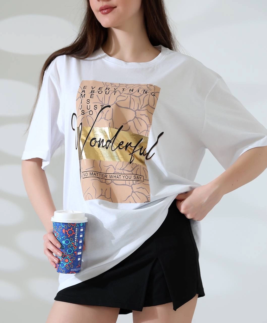 Özel varak baskı tekniği ile tasarlanmış olan bu tişört, hem göz alıcı hem de şık bir görünüm sunmaktadır.