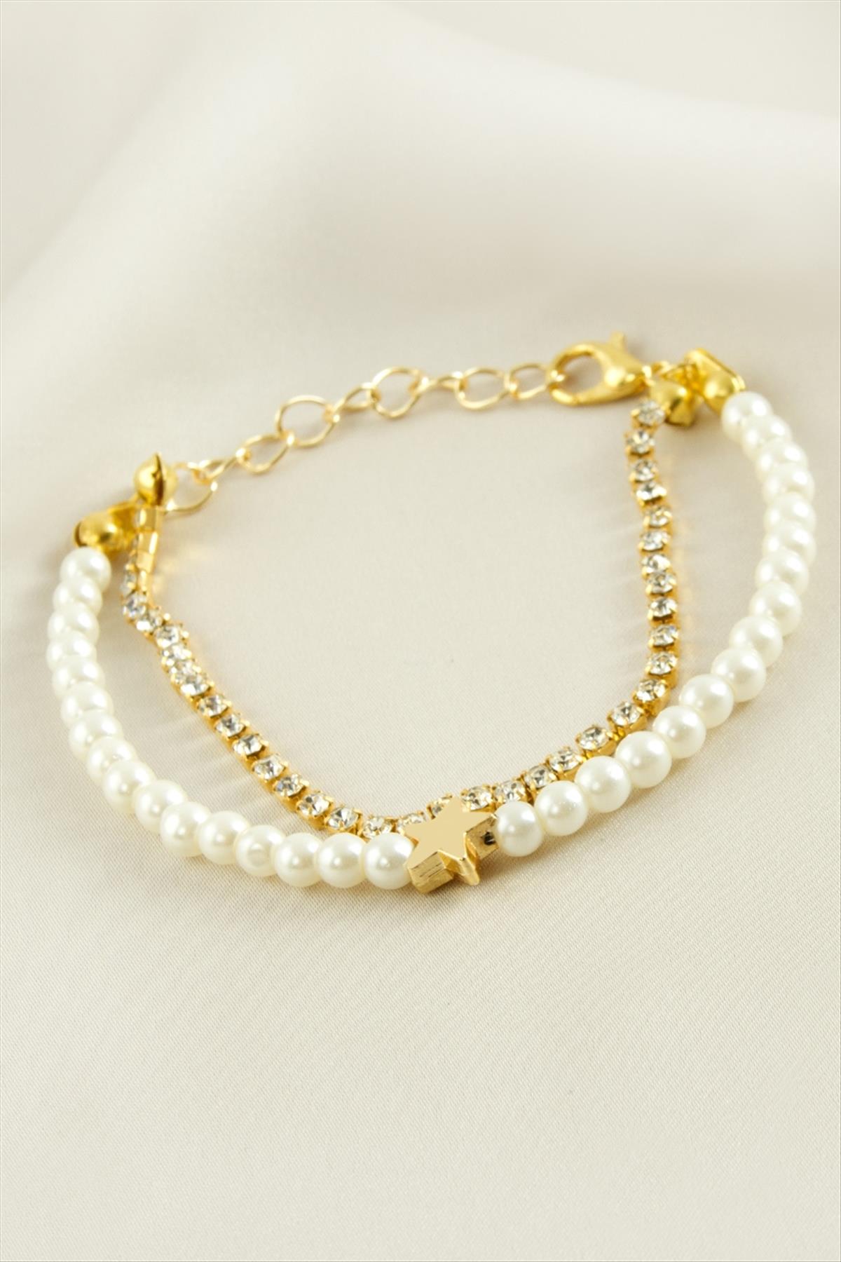 Yıldız Şerit Taşlı İnci Bileklik-Sarı