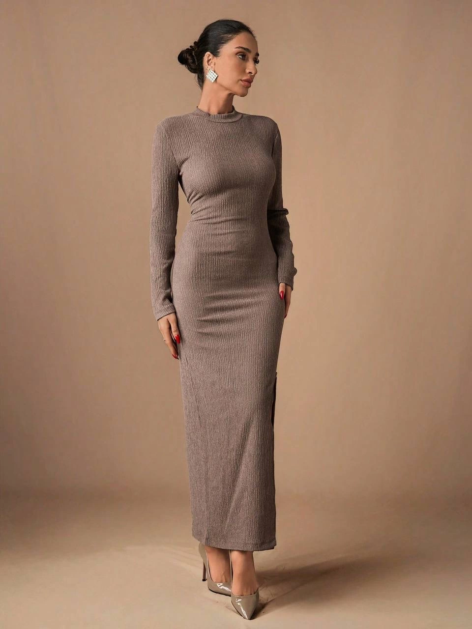 Yırtmaçlı kalın bürümcük uzun elbise vizon (Beden: S)