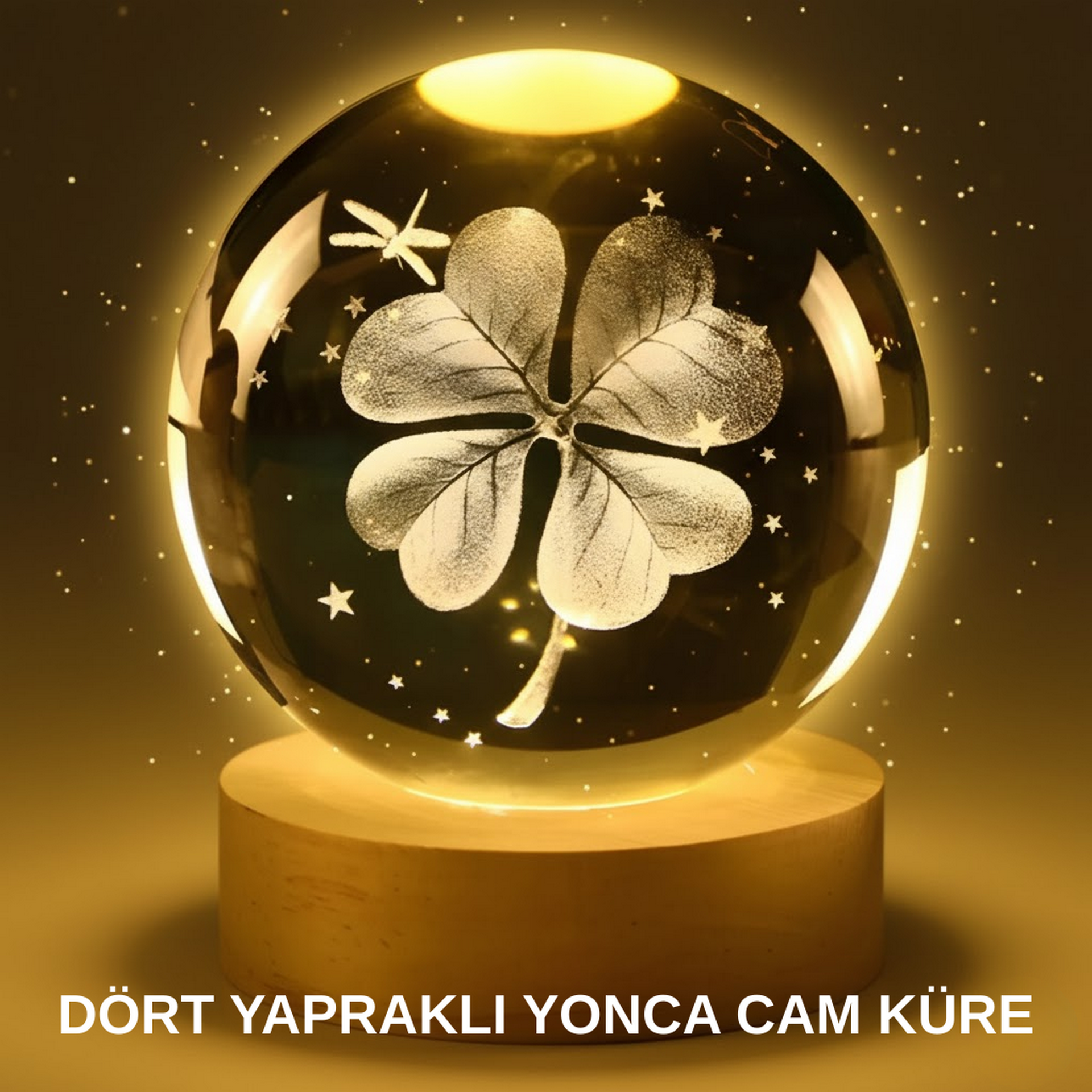 Yonca Bitki Figürlü LED Işıklı Cam Küre USB Ahşap Standlı Gece Lambası