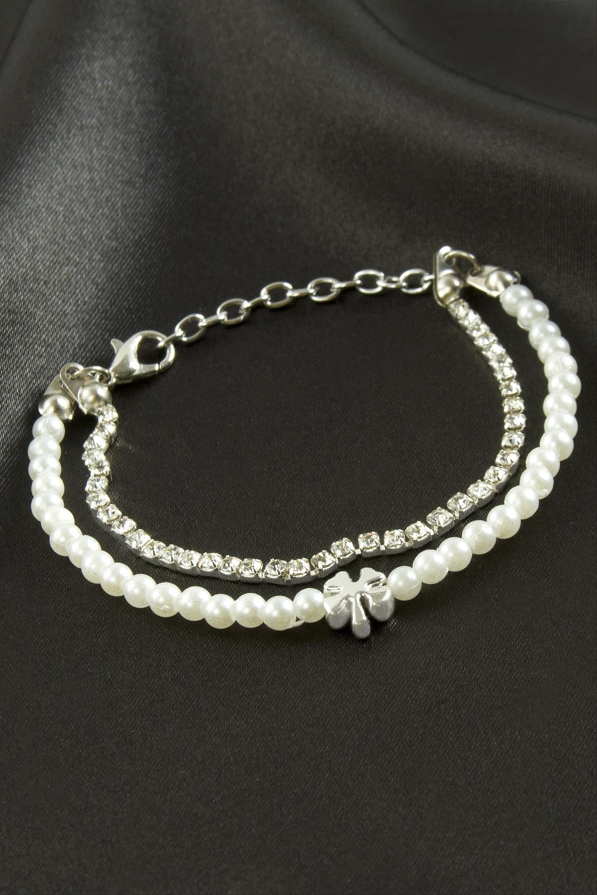 Yonca Şerit Taşlı İnci Bileklik-Gümüş Rengi