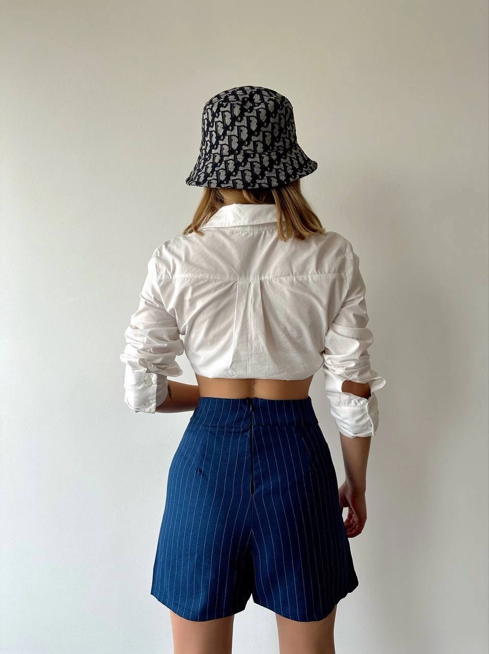 Zincir detaylı çizgili şort etek Lacivert (Beden: M)