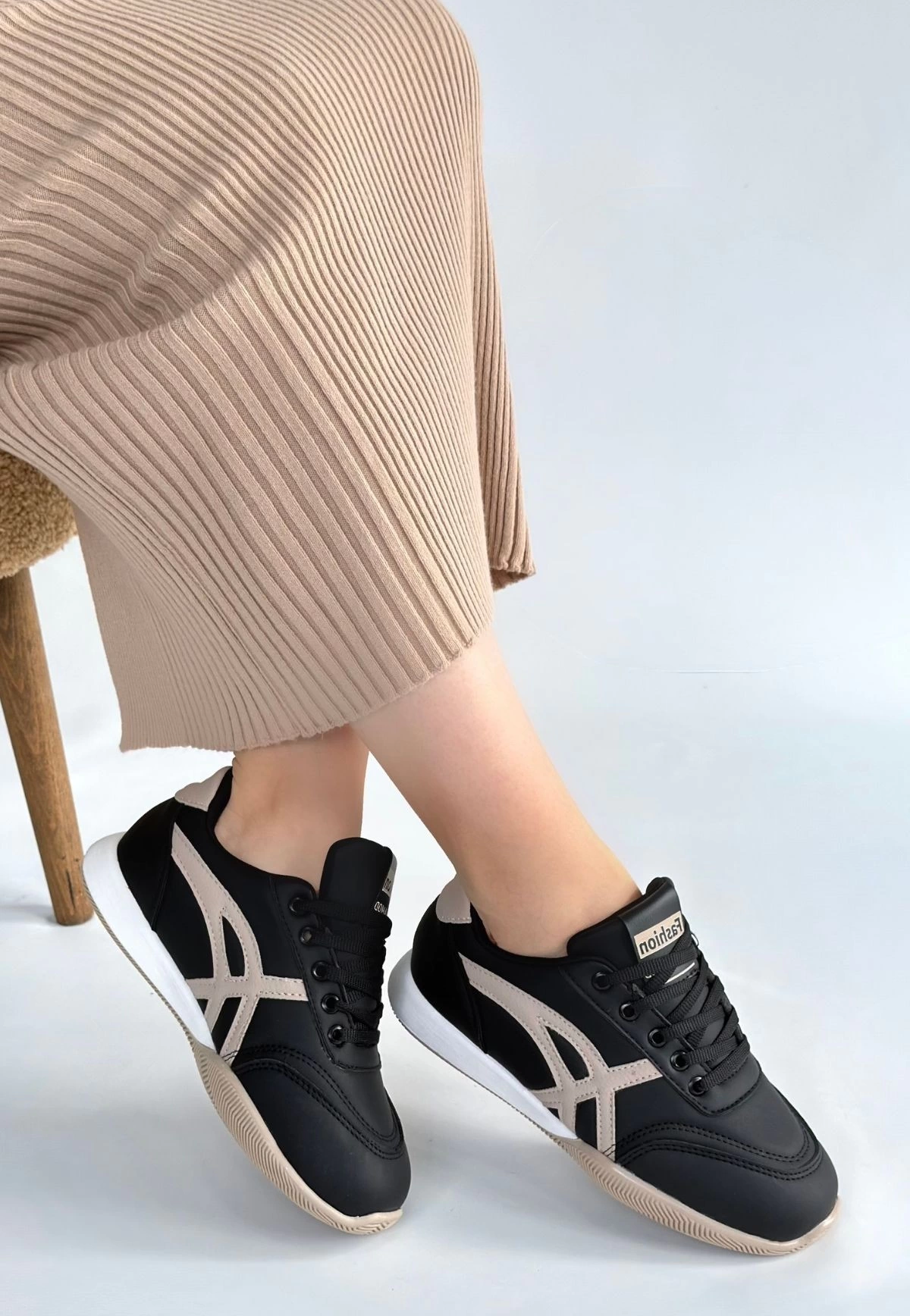 Zlay Siyah Cilt Bej Detaylı Bağcıklı Spor Ayakkabı (Numara: 38)